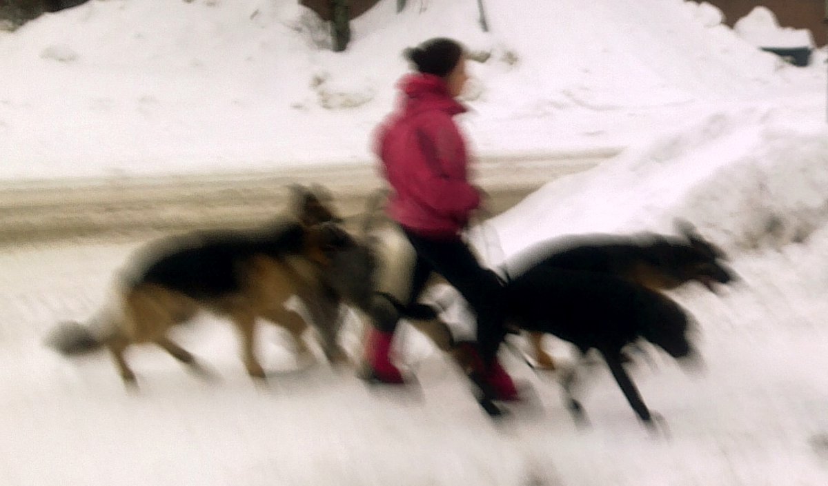 "4 koiraa lumisella kadulla taitavan taluttajan ohjauksessa."